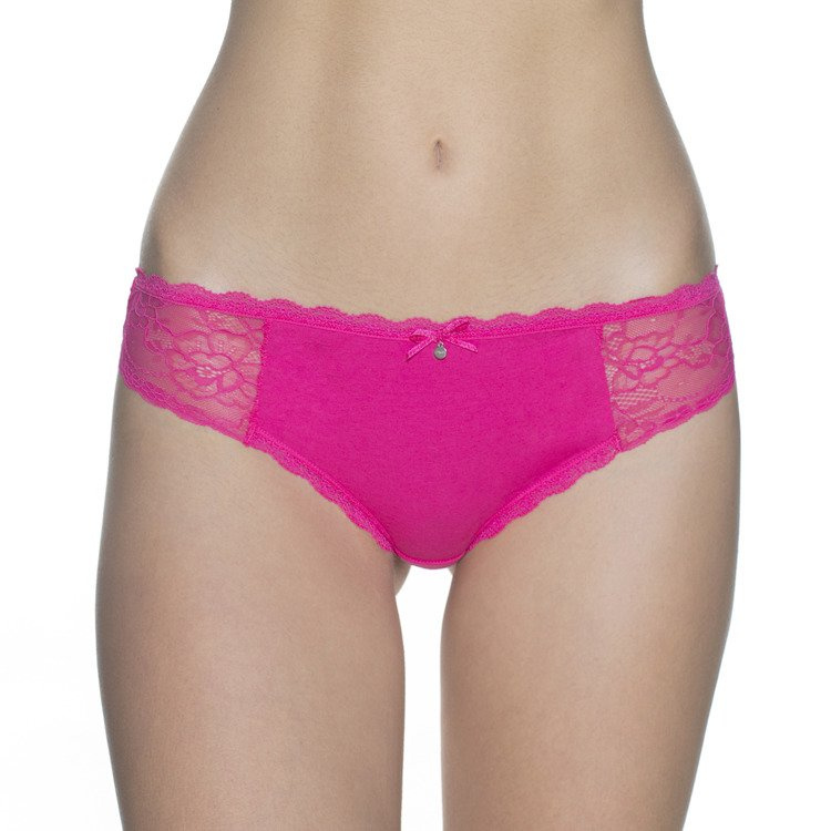 Figi damskie typu mini bikini z wysokiej jakości bawełny w intensywnych kolorach fluo. Biodra i tył zdobi efektowna koronka. W pasie ozdobna kokardka z zawieszką. Bielizna o niskim stanie, szerszym boku oraz częściowo zabudowanych pośladkach. Projektowane z myślą o zapewnieniu maksymalnego komfortu.
