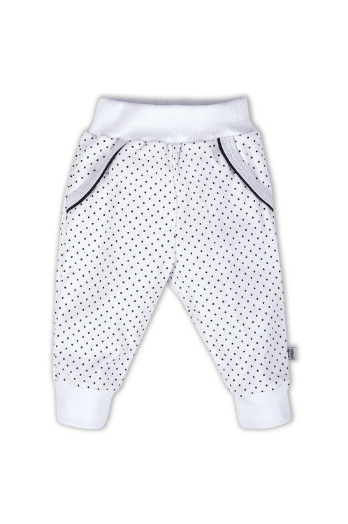 Wygodne, przyjemne spodnie w kolorze białym w czarne kropeczki, wykonane ze 100% bawełny. Charakteryzują się imitacją kieszonek po bokach. Szerokie ściągacze w pasie i na nóżkach zapewniają odpowiednie przyleganie, jednocześnie nie krępując ruchów dziecka i nie powodując u niego poczucia dyskomfortu.