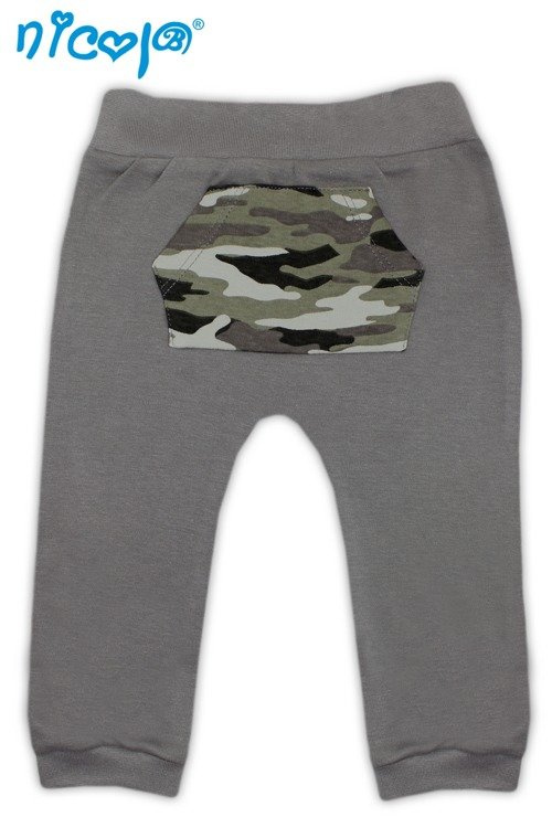 Wykonane ze 100% bawełny, bezpiecznej dla skóry dziecka. Wygodne szare spodenki, szyte od rozmiaru 56 do 86. Gumka w pasie zapewnia odpowiednią przyczepność, jednocześnie zachowując komfort dziecka. Ozdobiona kieszonką z motywem moro.