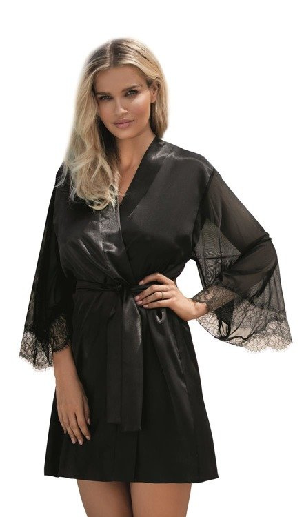 Elegancki i niezwykle seksowny szlafroczek z delikatnej satyny. Tiulowe rękawy wykończone koronką, dodają mnóstwo pikanterii. Praktyczne wiązanie w pasie idealnie dopasowuje się do sylwetki, uwydatniając atuty kobiecego ciała