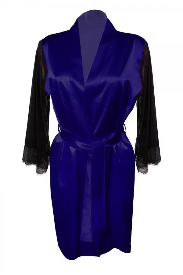 Elegancki i niezwykle seksowny szlafroczek z delikatnej satyny. Tiulowe rękawy wykończone koronką, dodają mnóstwo pikanterii. Praktyczne wiązanie w pasie idealnie dopasowuje się do sylwetki, uwydatniając atuty kobiecego ciała