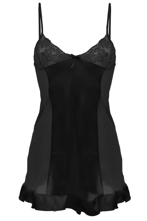 Zwiewna satynowa koszulka. Przód halki tworzą dopasowane, uszyte z koronki miseczki, które zapewniają komfort noszenia a jednocześnie zmysłowo eksponują dekolt.