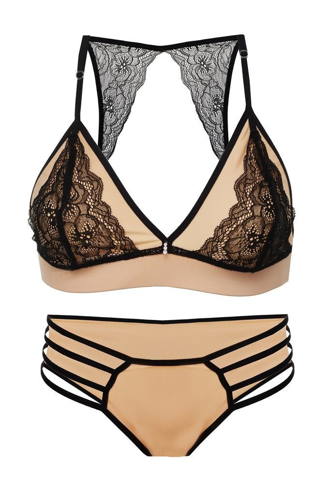 Seksowny komplet składający się z biustonosza wykonanego z miękkiego materiału ozdobiony śliczną koronką oraz zabudowanych fig. Biustonosz na elastycznej gumie ozdobiony na tyle delikatna koronką. Figi zdobią gumeczki.
