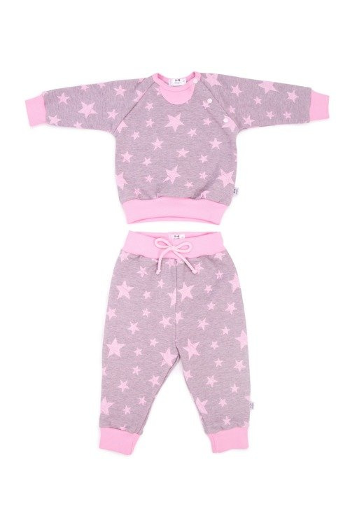 Komplet składa się z bluzy i spodenek. Całość wykonana jest z dzianiny bawełnianej. Bluza zapinana na bezniklowe napy. Spodenki wykończone z bezuciskowy ściągaczem.