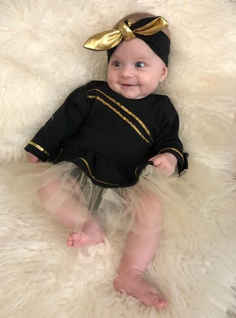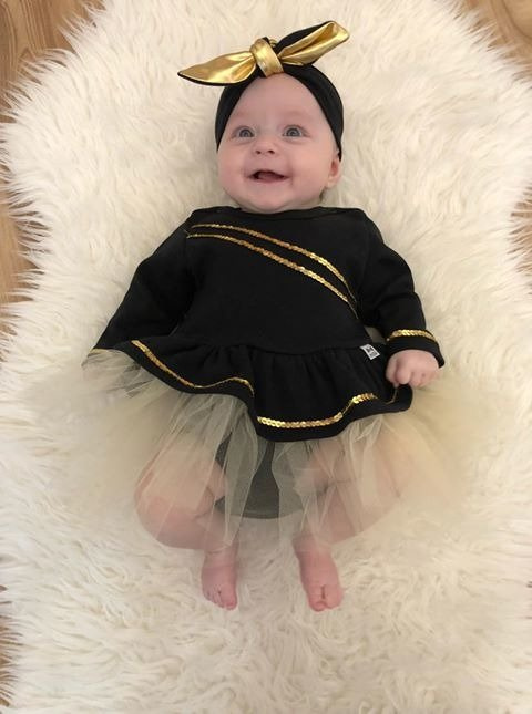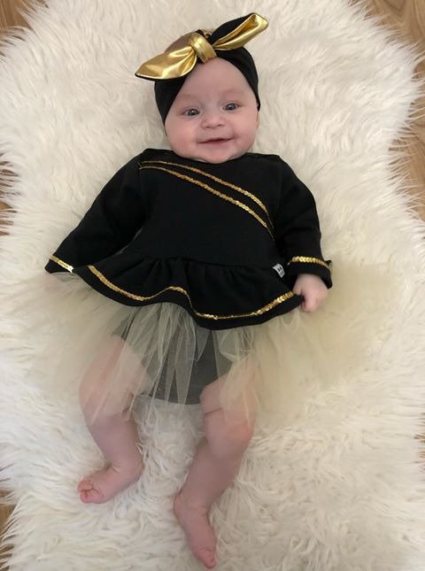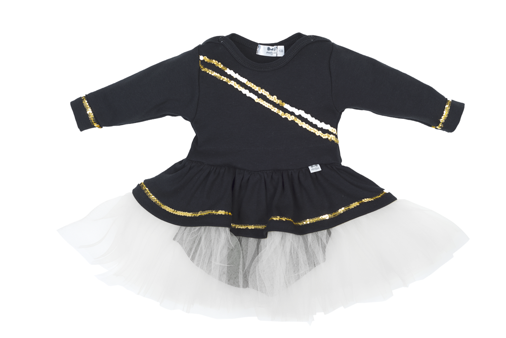 Urocze, dziewczęce sukienko-body, wykonane z 100% bawełny. Model zdobią złote cekiny oraz tiul. Zapinane na bezniklowe napki. Model bardzo ładnie komponuje się z pozostałymi ubrankami z kolekcji Little Star.