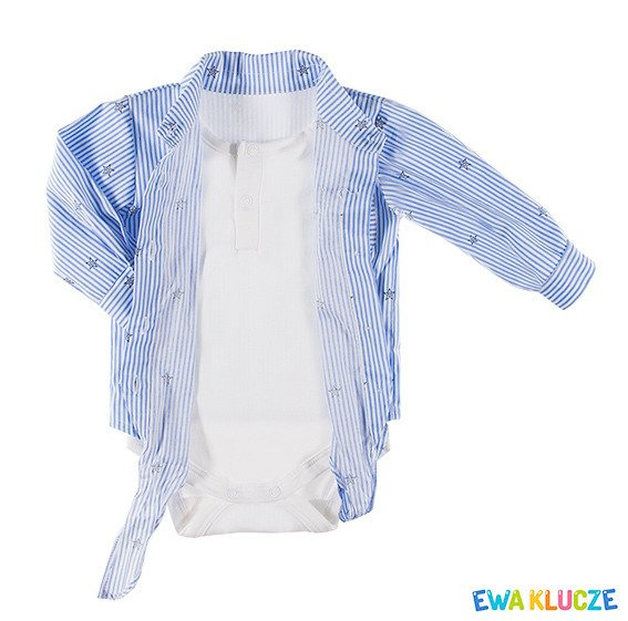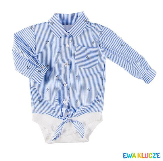 Body dziewczęce koszula z długim rękawem z kolekcji "Cosmos" uszyte z miękkiej i przyjemnej w dotyku dzianiny, połączonej z tkaniną w paseczki. Z przodu znajduje się kieszonka. Przód koszuli i rękawki są zapinane na guziczki. Dół koszuli umożliwia zawiązanie kokardki. Część dzianinowa przy szyjce i u dołu wykończona jest miękką lamówką Użyte napki nie zawierają niklu.