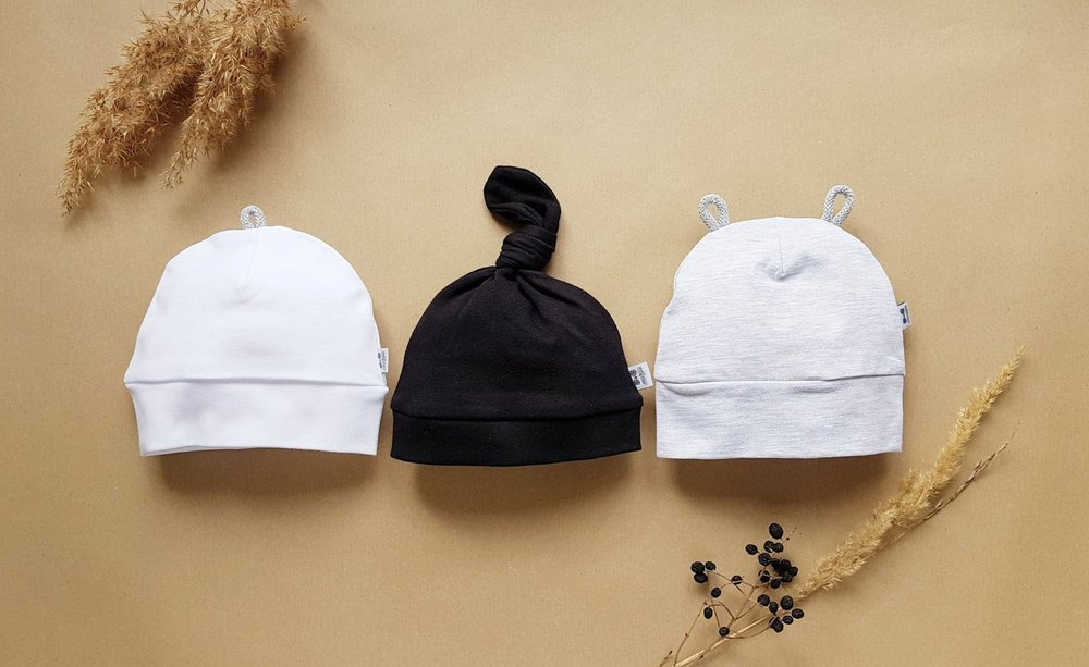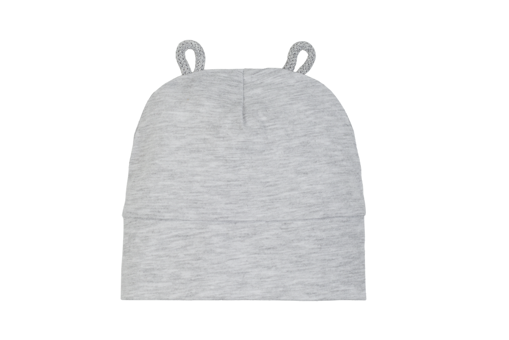Czapeczka w kolorze szarym. Dzięki użyciu odpowiednich materiałów (100% bawełny), czapka delikatnie dopasowuje się do kształtu głowy dziecka
