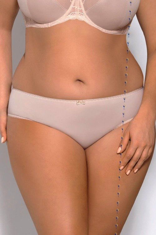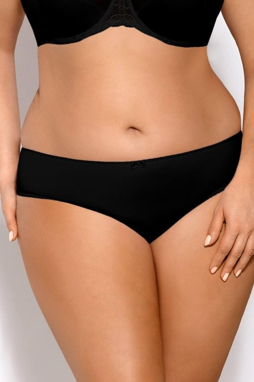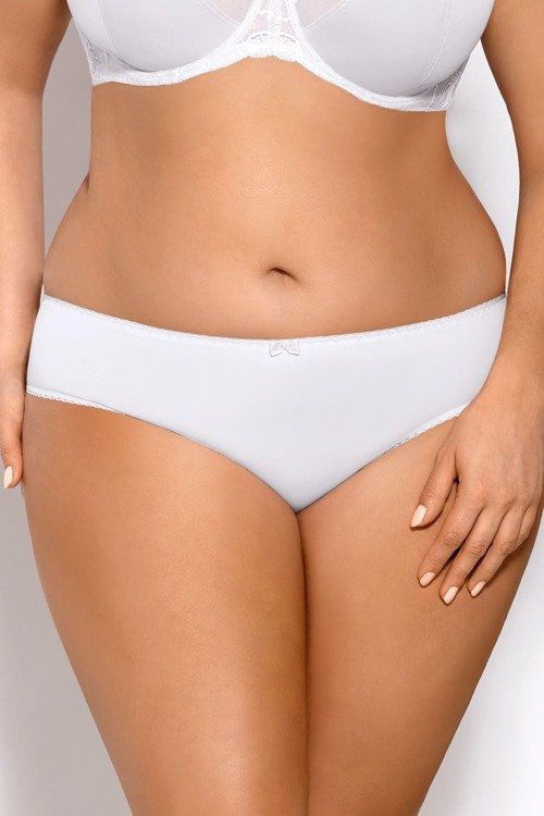 Klasyczne, gładkie figi wykonane z mikrofibry w połączeniu z delikatną koronką. Nogawki z przodu wykończone są subtelną gumokoronką. Tył wykończony jest koronkową lamówką. Przód ozdobiony jest małą kokardką.
