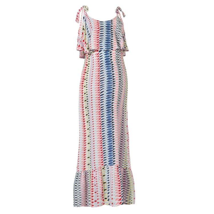 Sukienka o modnej długości maxi – wydłuży optycznie sylwetkę. Wiązane ramiączka pozwalają regulować głębokość dekoltu. Romantyczności sukience dodaje falbana, pod którą jest ukryty system do karmienia. Delikatny zamek błyskawiczny ułatwia komfortowy dostęp do karmienia w różnych sytuacjach.
