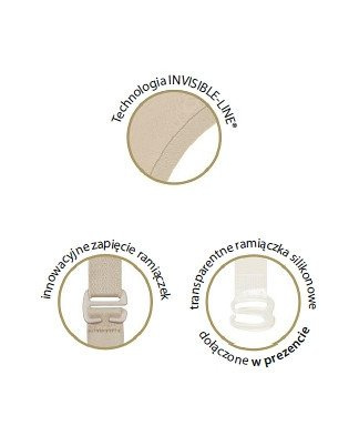 Korygujące body damskie pod biust. Niewidoczne pod ubraniem dzięki bezszwowej, nowoczesnej technologii wykończenia brzegów, ultracienkie - technologia INVISIBLE- LINE. Tył zdobią wstawki z transparentnej siateczki. Wykonane z delikatnego, oddychającego materiału idealnie dopasowuje się do sylwetki, specjalne panele materiałowe tworzą elastyczne strefy wyszczuplenia, spłaszcza brzuch, wysmukla talię, unosi pośladki, posiada regulowane zapięcie w kroku. Regulowane, odpinane ramiączka z innowacyjnym zapięciem. W komplecie dodatkowe silikonowe ramiączka.
