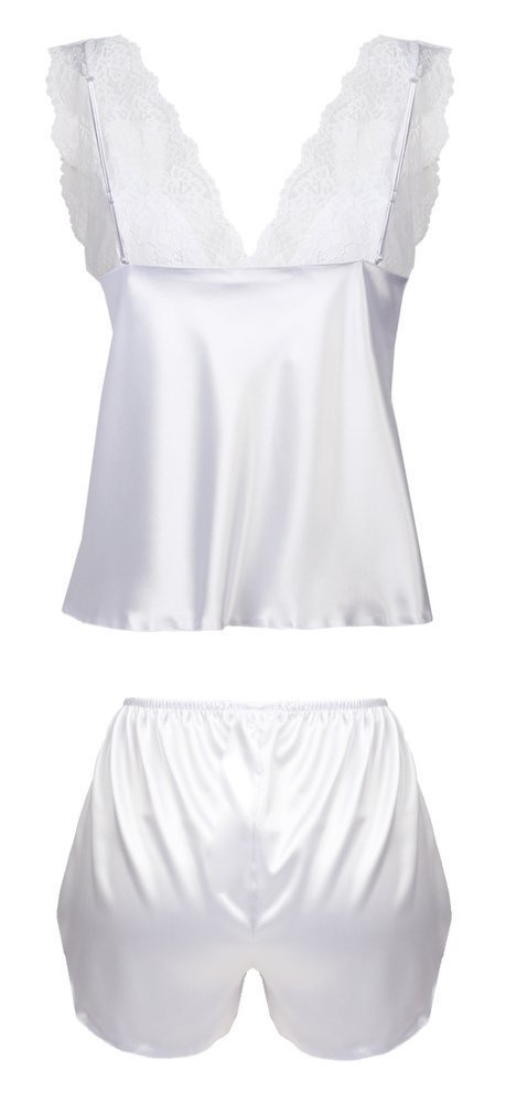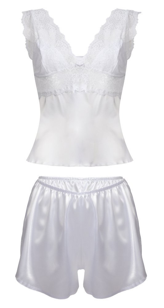 Satynowy dotyk. Komplet składa się  z koszulki oraz spodenek. Koszulka wykonana z zwiewnej satyny natomiast góra wykończona wzorzystą koronką, miseczki podszyte satyną kryjąc nasze atuty.