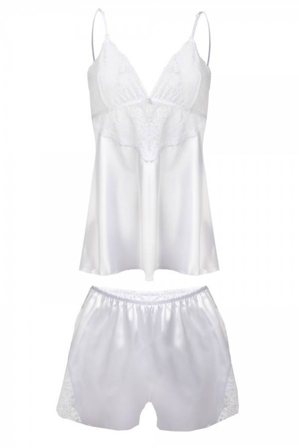 Satynowy komplecik który składa się koszulki oraz spodenek. Góra koszulki zdobi wzorzysta koronka oraz z tyłu został wszyty trójkąt z koronki. Reszta uszyta z zwiewnej satyny.