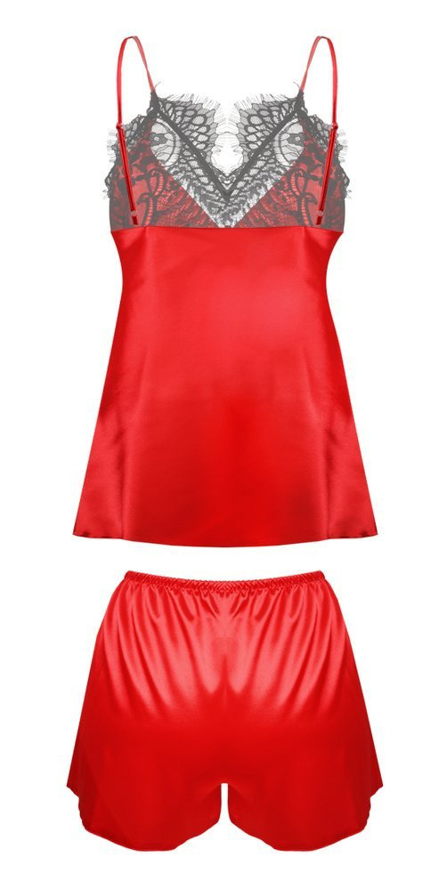 Uwodzicielski komplecik satynowy składający się z dwóch części. Góra koszulki jest uszyta z przepięknej koronki. Miseczki są podszyte satyną która kryje kobiece atuty. Dół i tył koszulki wykończony satyną. Spodenki uszyte z delikatnej satyny. Ramiączka cienkie regulowane.