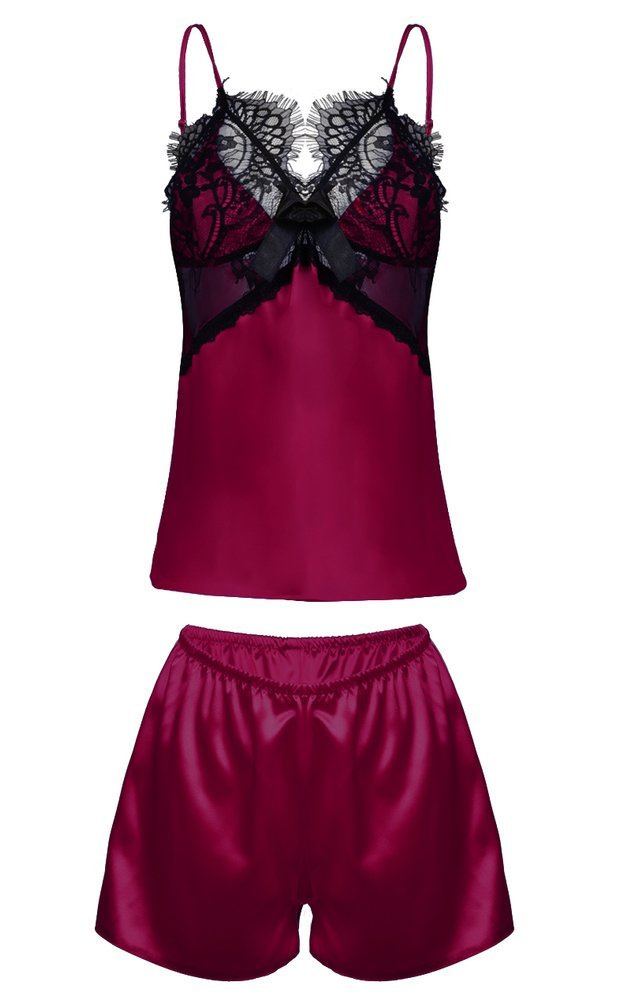 Uwodzicielski komplecik satynowy składający się z dwóch części. Góra koszulki jest uszyta z przepięknej koronki. Miseczki są podszyte satyną która kryje kobiece atuty. Dół i tył koszulki wykończony satyną. Spodenki uszyte z delikatnej satyny. Ramiączka cienkie regulowane.