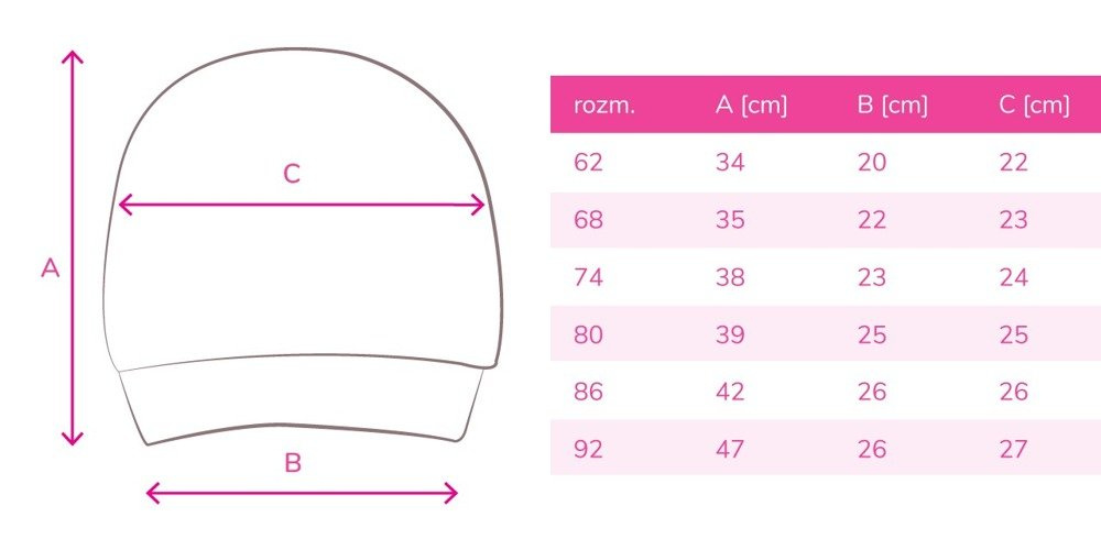 Czapeczka z ozdobnym nadrukiem w jednorożce. Dzięki użyciu odpowiednich materiałów (100 % bawełny), czapka delikatnie dopasowuje się do kształtu głowy dziecka.