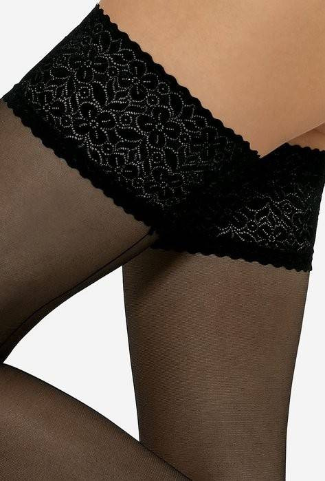 Pończochy damskie samonośne z lycry, grubość 20 den. Ozdobione wyhaftowanym szwem i koronką na silikonie.
