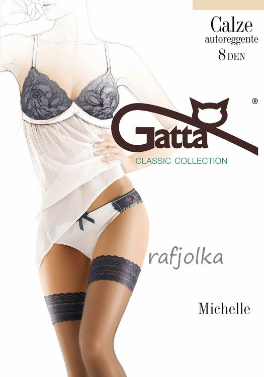 Pończochy damskie samonośne. Z przędzy typu Lycra oplatana, przezroczyste, matowe. Ozdobione koronką na silikonie.