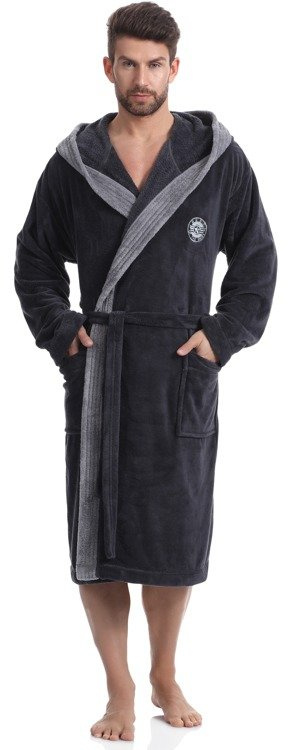 Długi, jednolity szlafrok męski George o klasycznym kroju z kapturem. Szlafrok wiązany w pasie, dodatkowo posiada dwie kieszenie oraz na wysokości klatki piersiowej naszytą aplikację. .