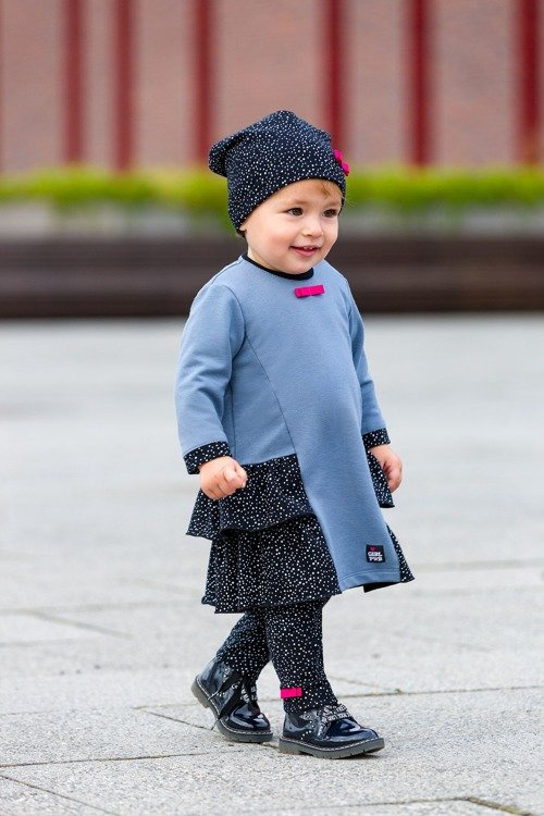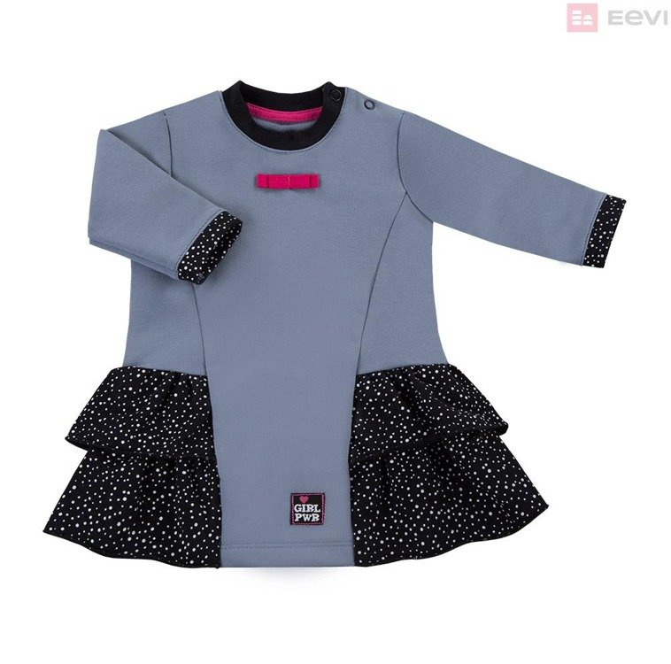 Sukienka z falbanką z kolekcji "Power" uszyta z miękkiej i przyjemnej w dotyku dzianiny. Na przodzie sukienki znajduje się niewielka naszywka zabezpieczony od wewnątrz tak, alby nie podrażniała delikatnej skóry dziecka. Elementem ozdobnym jest naszyta różowa kokardka oraz czarne kontrastujące falbany. Wygoda i słodycz w jednym.