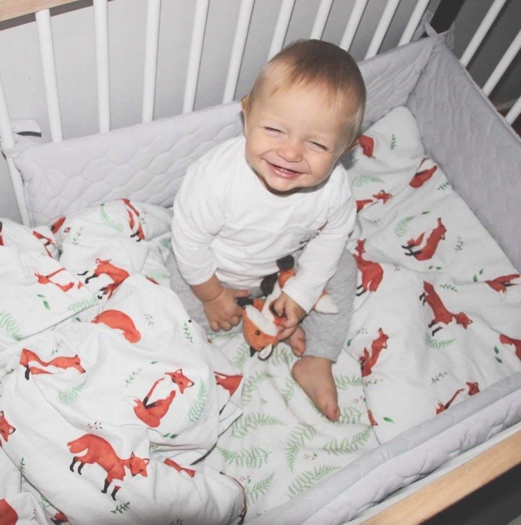 Cieplutki komplet pościeli z wszytym wypełnieniem, doskonały do kołyski, łóżeczka i na popołudniową drzemkę.