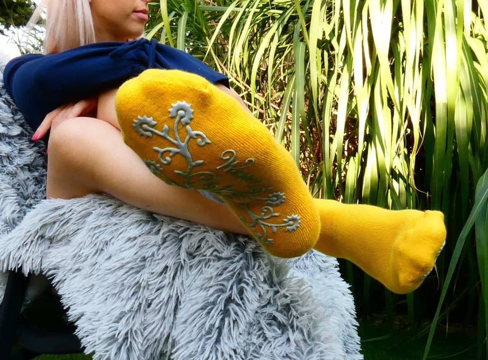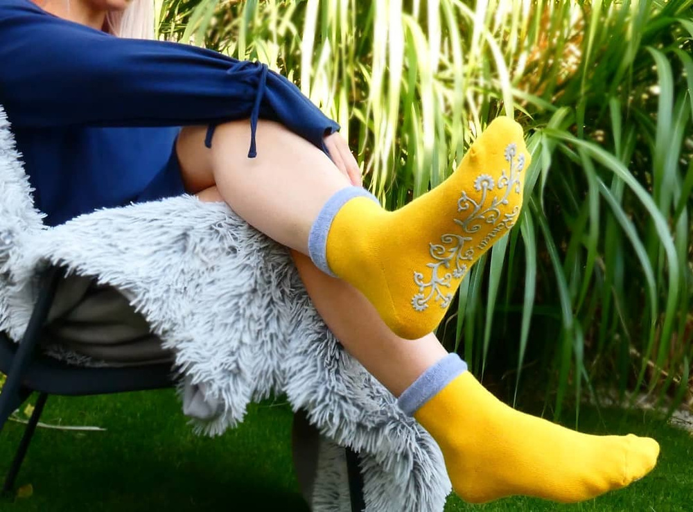 Ciepłe skarpety damskie wykonane z wysokiej jakości bawełny. Posiadają wywijany ściągacz oraz podeszwę ABS.