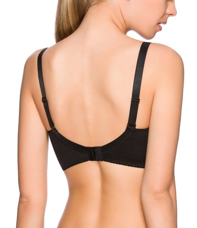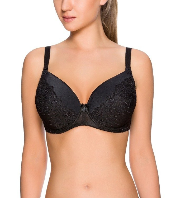 Klasyczny, usztywniany biustonosz zachowany w śnieżnobiałej tonacji lub zmysłowej czerni. Idealny dla kobiet ceniących sobie wygodę i elegancję zarazem. Dolna część miseczek oraz boczki ozdobione przepięknie haftowaną koronką. Na złączeniu miseczek subtelna kokardka dodająca modelowi niewątpliwego uroku. Dla poprawienia komfortu ramiączka są szerokie, odpinane z możliwością regulacji.