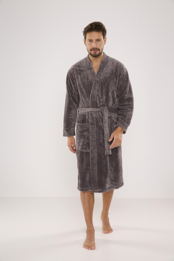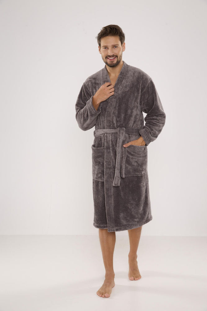Długi szlafrok męski z miękkiej dzianiny typu soft. Wiązany w pasie, na biodrach kieszenie zewnętrzne, na wysokości klatki piersiowej naszyta aplikacja. Miły i przyjemny w dotyku, gwarantuje komfort noszenia. Główną zaletą tego modelu jest cieplutka i miła w dotyku pluszowa tkanina idealnie wchłaniająca wodę.