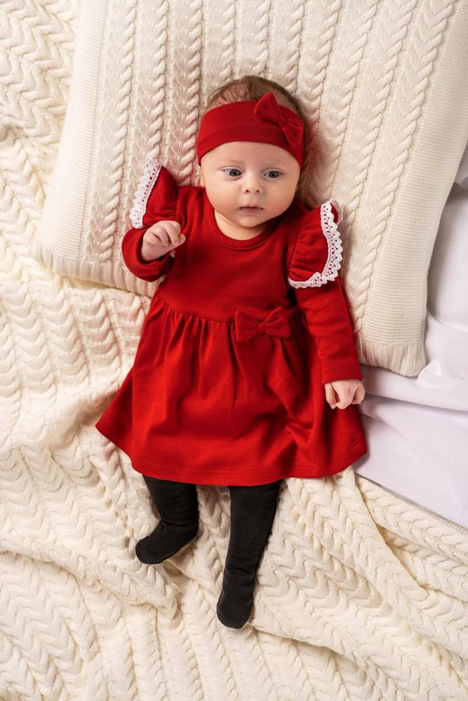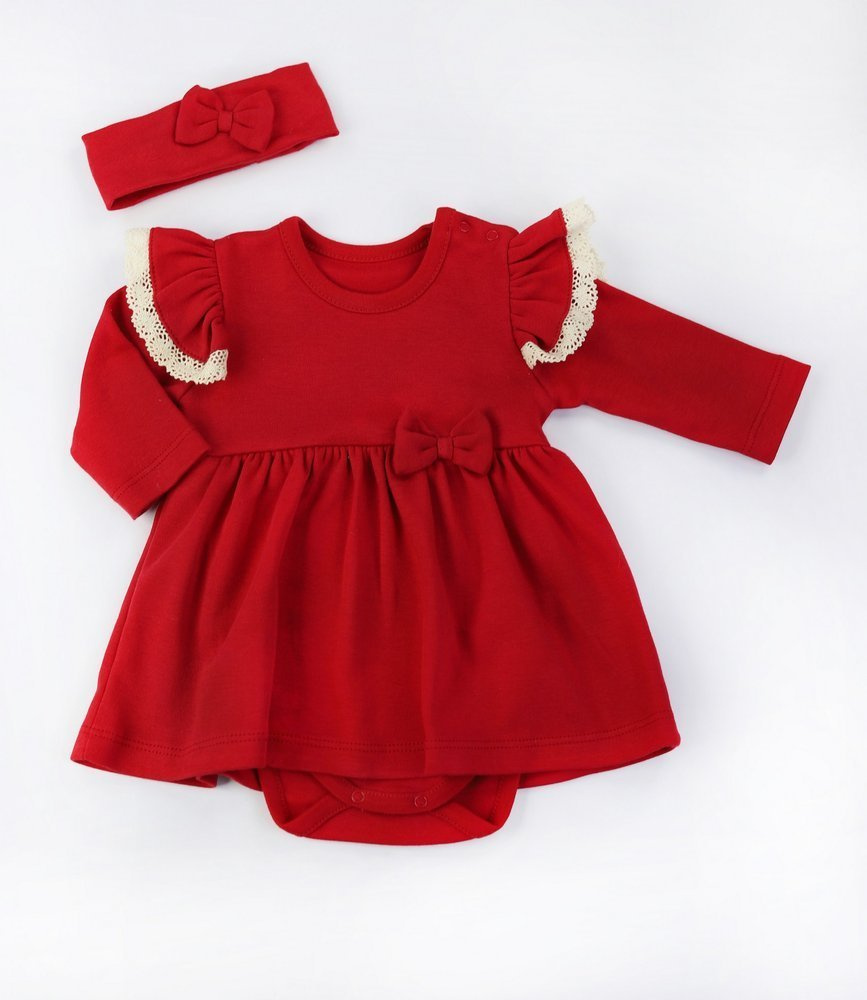 Model w czerwonym kolorze, ozdobiony falbanką na ramionach. W zestawie opaska. Idealna kreacja dla małej damy.