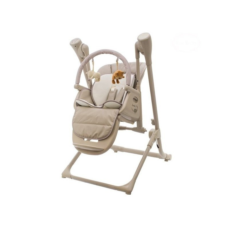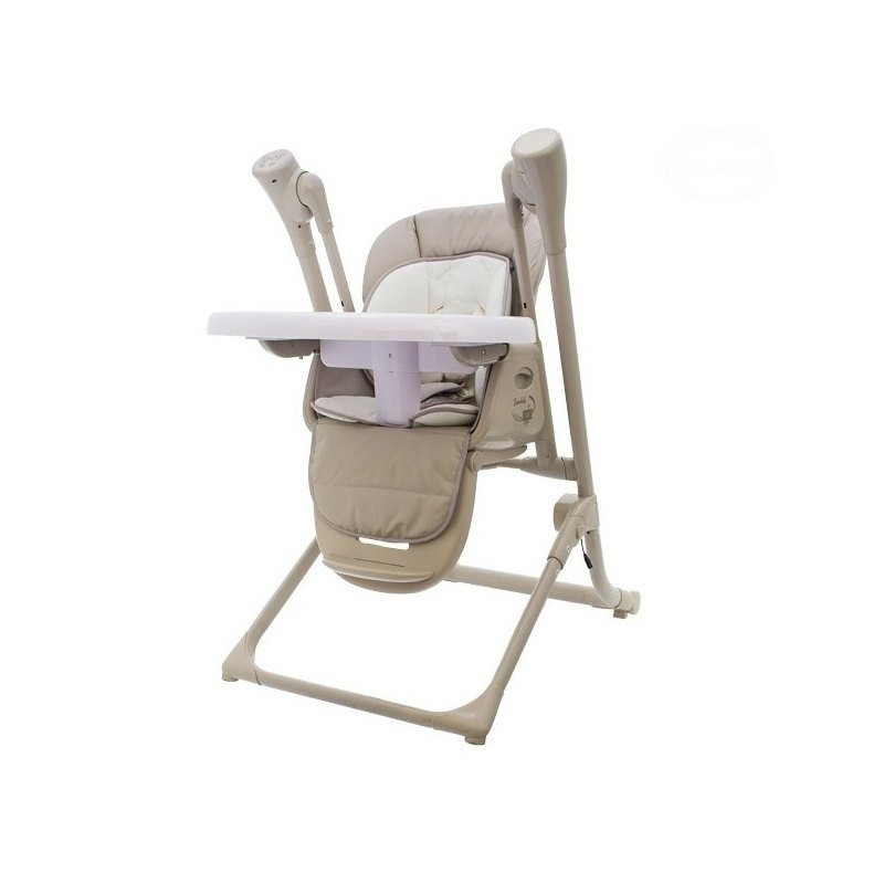 Krzesełko do karmienia z funkcją huśtawki. Krzesełko posiada 6 dostępnych wysokości i cztery pozycje regulacji oparcia. Funkcja huśtawki dostępna w najniższej pozycji. Możliwość ustawienia tacy do karmienia w trzech pozycjach. Blat jest dwuczęściowy i może być dostosowywany do posiłków lub zabawy. Regulowany podnóżek. Produkt posiada panel kontrolny, na którym umieszczone są: pięć diod pokazujących aktualną prędkość huśtania, timer z trzema przedziałami czasowymi, przycisk muzyczny.