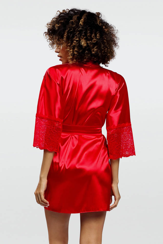 Kusząca, a zarazem elegancka satynowa podomka, która powinna się znaleźć w garderobie każdej kobiety. Rękawy wykończone szeroką koronką, co dodaje lekkości i kobiecości. Szlafrok zalotnie wiązany w pasie. Skład: 100% poliester.