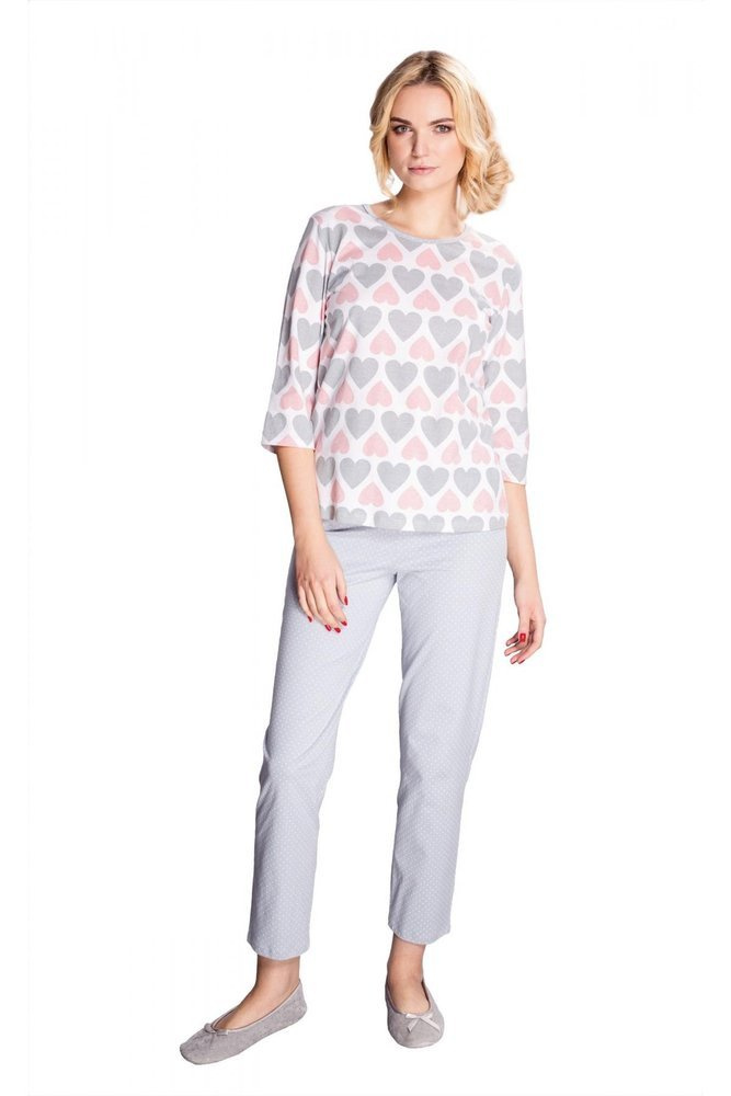 Kelly to urocza, bawełniana piżama w pastelowych odcieniach. Góra posiada print w szaro- różowe serduszka ,a spodnie w małe kropki. Prosty krój, okrągły dekolt , rękawki ¾ tworzą prostą, ale ujmującą kombinację. Piżama została uszyta z najwyższej jakości bawełny od polskiego producenta.