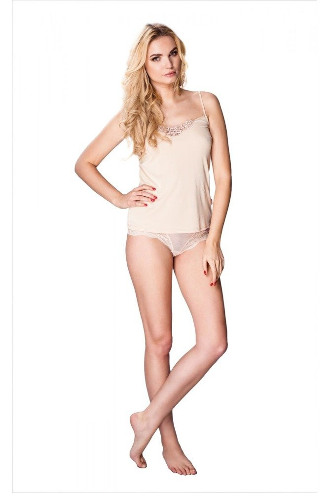 Koszulka Oliwia wykonana z dzianiny wiskozowej o właściwościach zdrowotnych. Model na wąskim ramiączku i z delikatną ozdobną aplikacją, która pozwoli każdej kobiecie poczuć się wyjątkowo, elegancko i bardzo kobieco. Koszulka, która posiada tzw. ciecia francuskie, mające za zadanie dostosowana bluzeczki do kształtów ciała, przez co rzecz jest idealnie dopasowana. Koszulka NICOLE niezbędna w każdej kobiecej szafie.