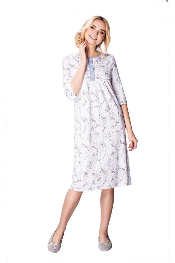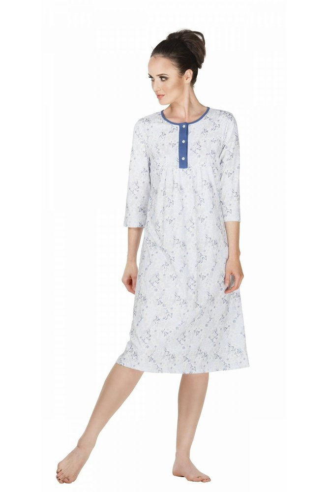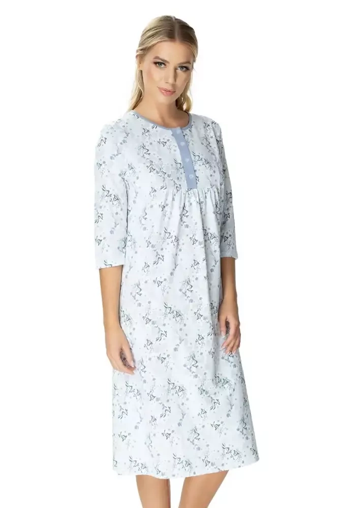 Koszula nocna Helena wykonana jest z najwyższej klasy bawełny od polskiego producenta. Koszula nocna posiada rozpinany dekolt oraz rękaw 3/4. Pokryta jest delikatnym wzorem w kształcie kwiatów w odcieniach koloru niebieskiego. Koszula nocna idealnie nadaje się na każda porę roku.