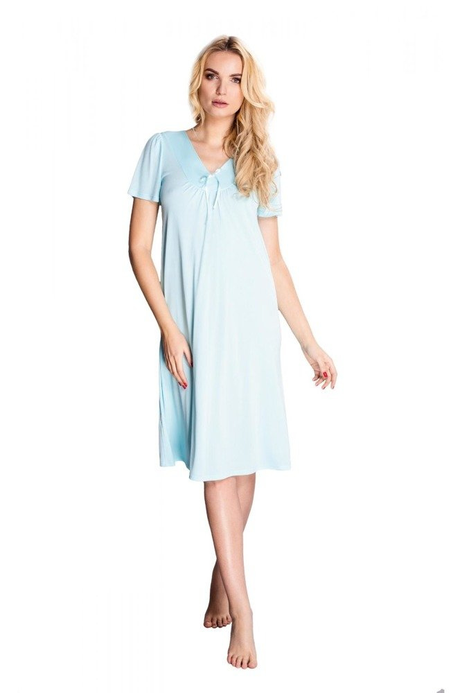 Niezwykła w swej prostocie koszula nocna z krótkim, szerokim rękawem wykonana ze zdrowej dzianiny wiskozowej. Model o luźnym kroju z dekoltem w kształcie litery “V”z niewielkim marszczeniem podkreślającym kobiece atuty. Zakończona zalotną atłasową kokardką. Długość koszuli za kolana – co zadowoli wymagające panie.