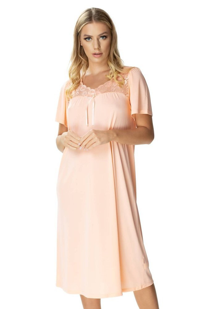 Koszula nocna wykonana z dzianiny wiskozowej z krótkim rękawem o długości - za kolano. Elementem zdobniczym jest zastosowanie elastycznej, miękkiej koronki o motywie kwiatowym, która nadaje uroku i kobiecości. Całość dopełnia delikatna kokardka.