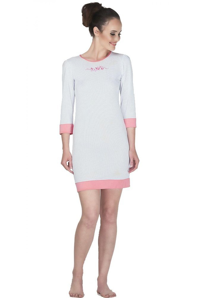 Bardzo dziewczęca koszula nocna z nadrukiem w drobne kropki.Posiada rękawy o długość 3/4 wykończone koralowymi mankietami. Wykonana została z delikatnego jedwabiu wiskozowego słynącego ze swych niezastąpionych właściwości. Dzianina nie podrażnia, nie uczula posiada bardzo miękki i przyjemny chwyt. Haft na dekolcie, który dodaje jej uroku i oryginalności.