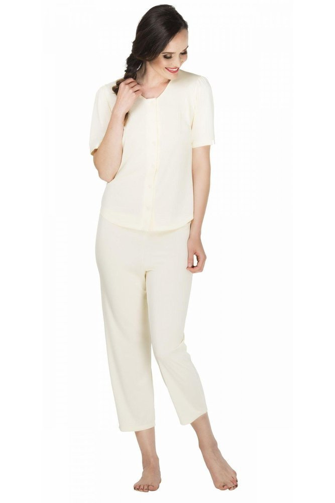 Piżama Elizabethto wyjątkowo kobieca piżama wykona z wysokiej jakości wiskozy wyprodukowanej w Polsce. Piżama posiada spodnie o długości 7/8 wykończone delikatną gumką w pasie oraz rękawek 3/4. Rozpinany dekolt idealnie sprawdzi się również dla mam karmiących.