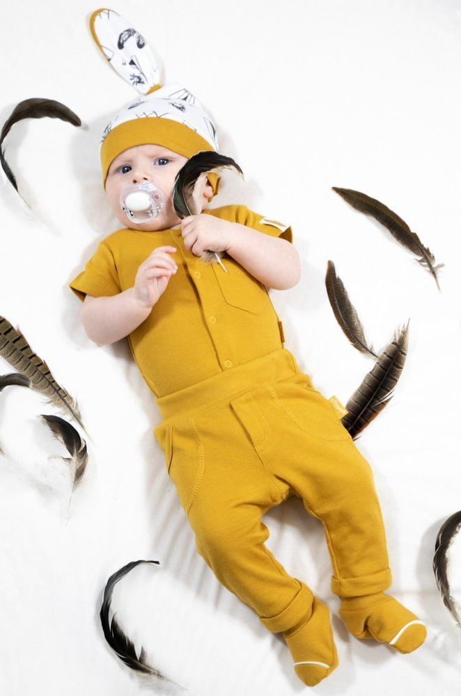 Wykonane ze 100% bawełny, bezpiecznej dla skóry dziecka. Wygodne spodenki w miodowym kolorze.