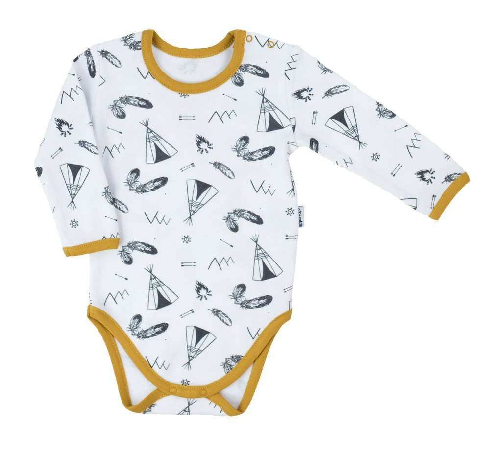 Praktyczne i wygodne body z kolekcji Indian. Wykonane z mięciutkiej bawełny drukowanej bezpieczną farbą wodną. Zapinane na bezniklowe napki.