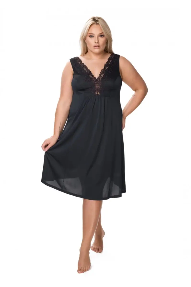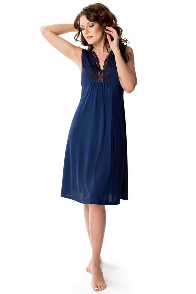 Koszula w dwóch klasycznych kolorach- intensywnym granacie i głębokiej czerni. Dekolt ozdobiony koronką. Doskonała konstrukcja miseczek zapewnia komfort użytkowania nawet klientkom z większym biustem. Model delikatnie rozkloszowany, zwiewny i zmysłowy.