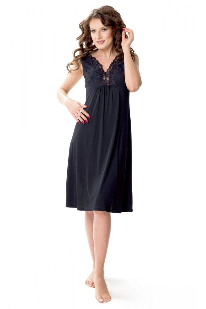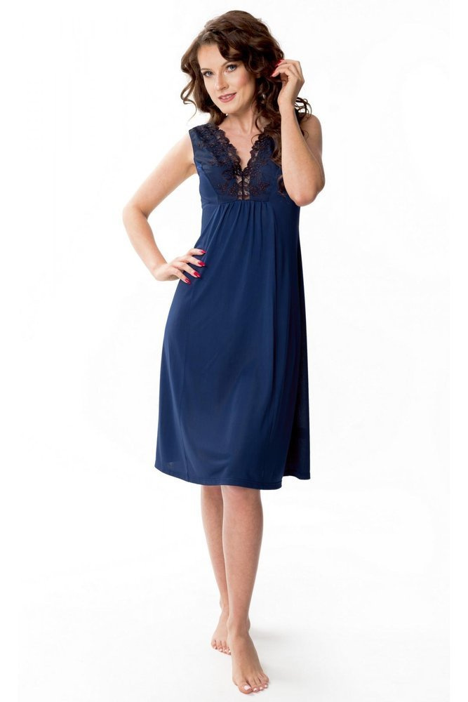 Koszula w dwóch klasycznych kolorach- intensywnym granacie i głębokiej czerni. Dekolt ozdobiony koronką. Doskonała konstrukcja miseczek zapewnia komfort użytkowania nawet klientkom z większym biustem. Model delikatnie rozkloszowany, zwiewny i zmysłowy.
