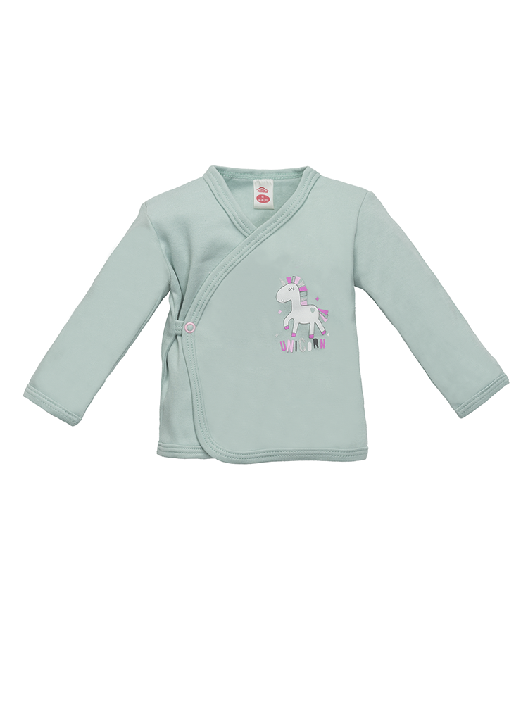 Kaftanik niemowlęcy z aplikacją jednorożca. Wykonany ze 100% bawełny. Zapinany kopertowo,na wierzchu na dwie malutkie napy, a pod spodem na jedna. Wykończony lamówką.
