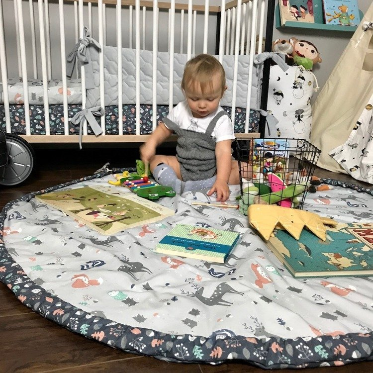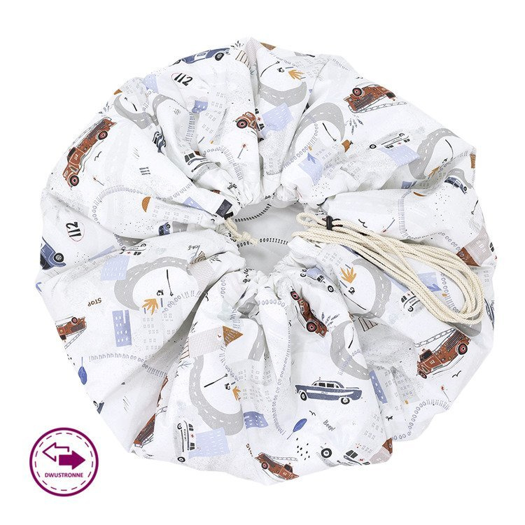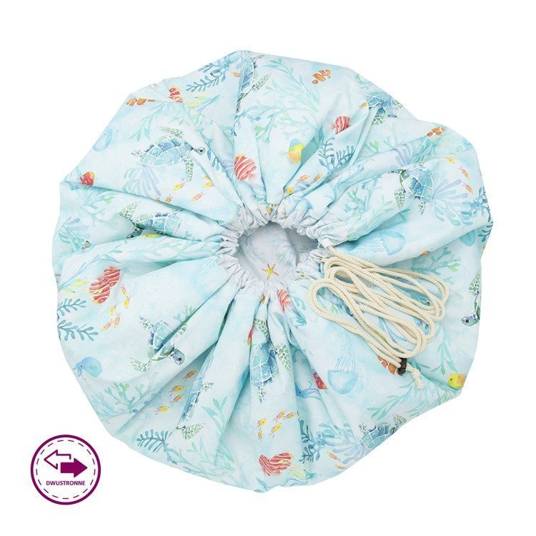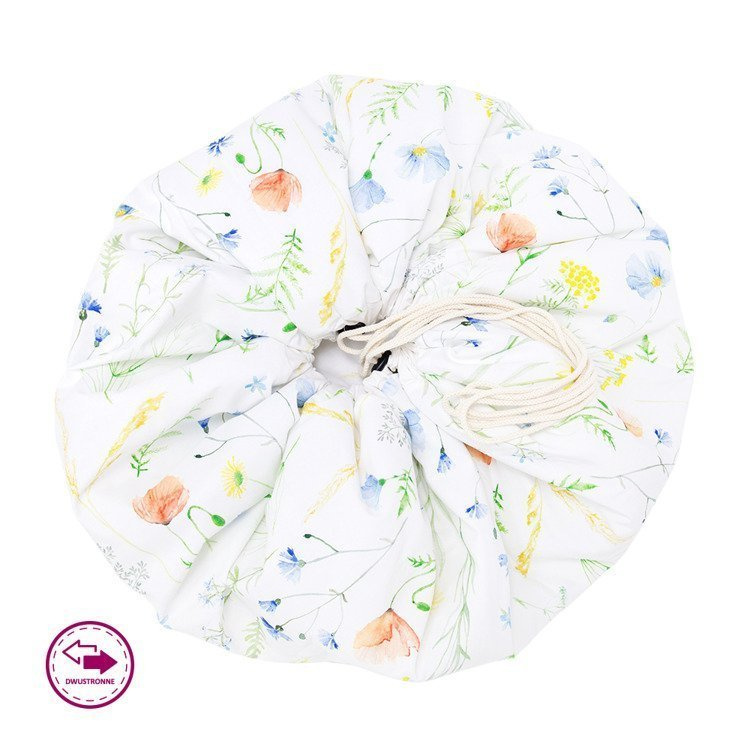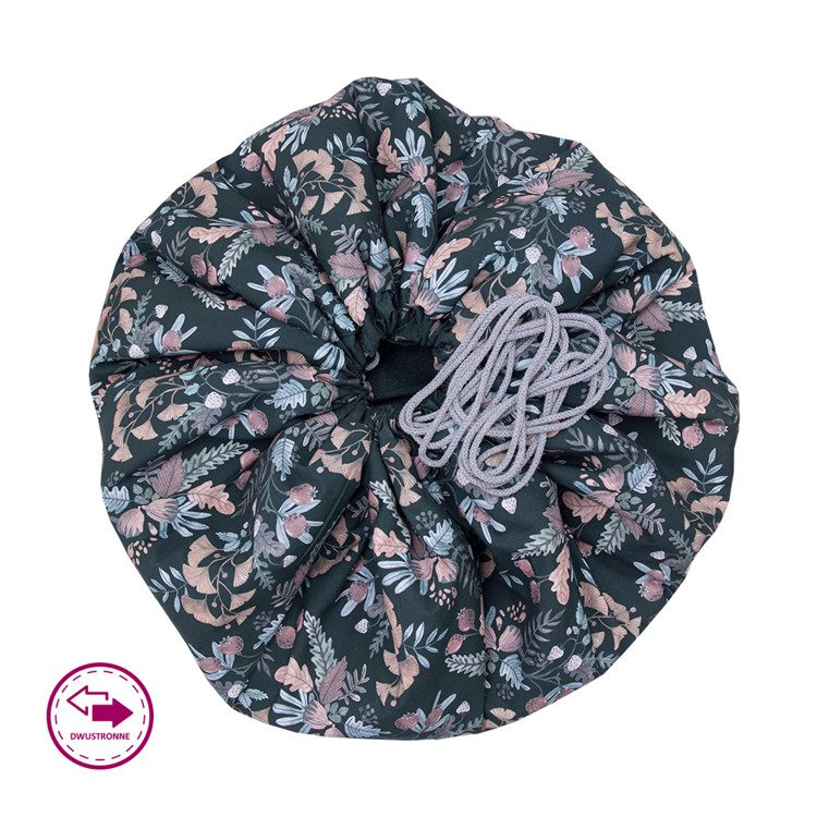 Mata do zabawy została uszyta w taki sposób, aby po zakończonej zabawie zwinąć ją szybko razem z zabawkami i nie martwić się o bałagan. W obwód ma wszyty mocny sznurek, który zaciąga się tworząc z maty duży worek na zabawki.