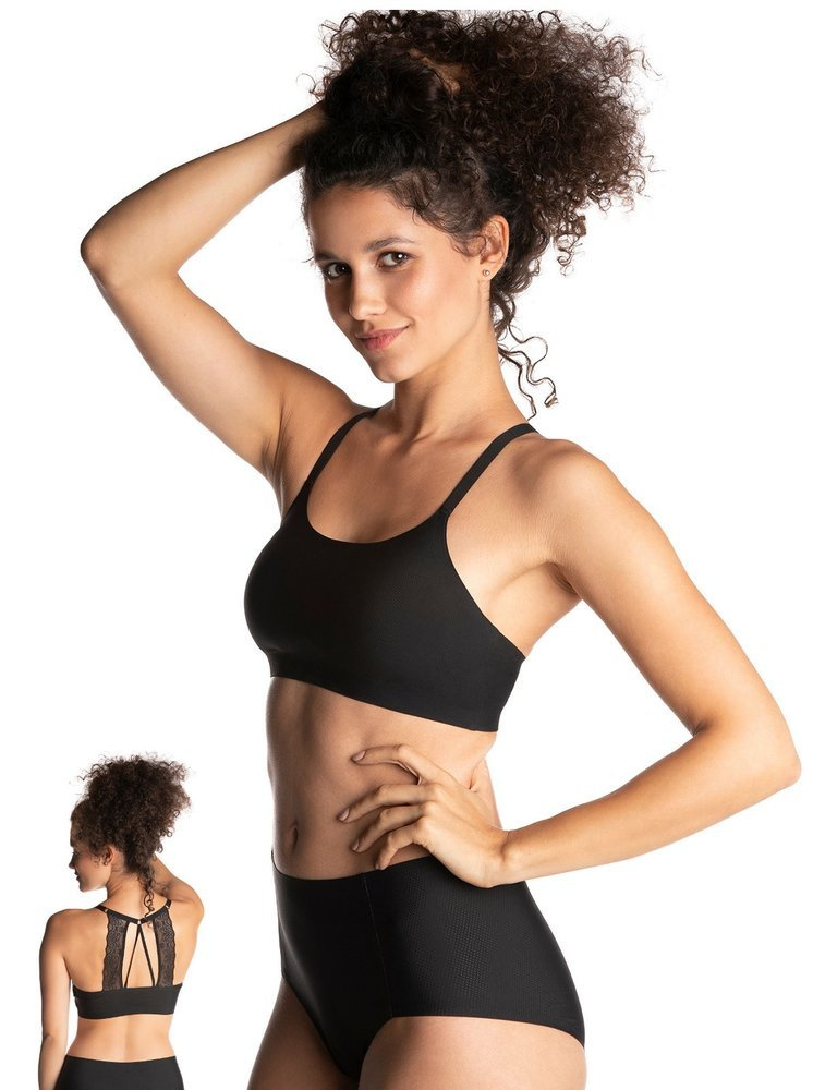 Biustonosz typu top wykonany z wysokiej jakości miękkiej oraz oddychającej dzianiny. Miseczki delikatnie usztywnione gąbeczką, bez fiszbin. Tył zdobi efektowna koronka i elastyczne paseczki. Top wkładany przez głowę, posiada nieregulowane ramiączka. Wykonany w technologii laserowej z ultracienkim wykończeniem brzegów.