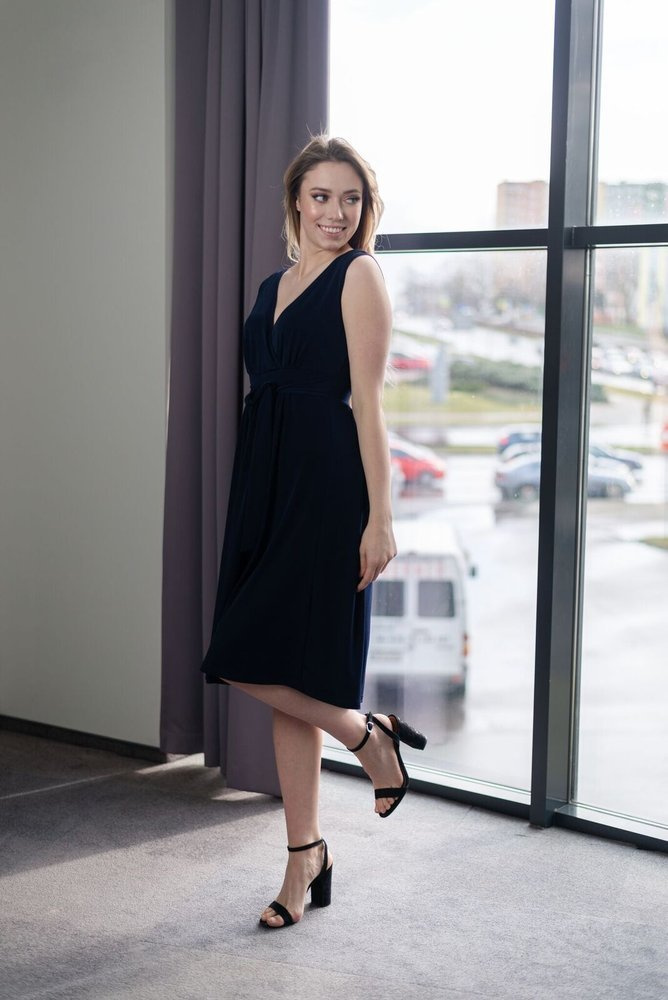 Efektowna zwiewna sukienka bez rękawów mieszcząca każdej wielkości ciążowy brzuszek. Marszczenia oraz pasek dodają jej lekkości i elegancji