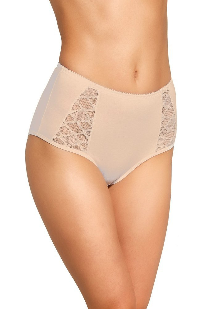 Efektowne bawełniane figi damskie z wysoką linią talii, zabudowane na biodrach. Przód został ozdobiony koronkowymi wstawkami.