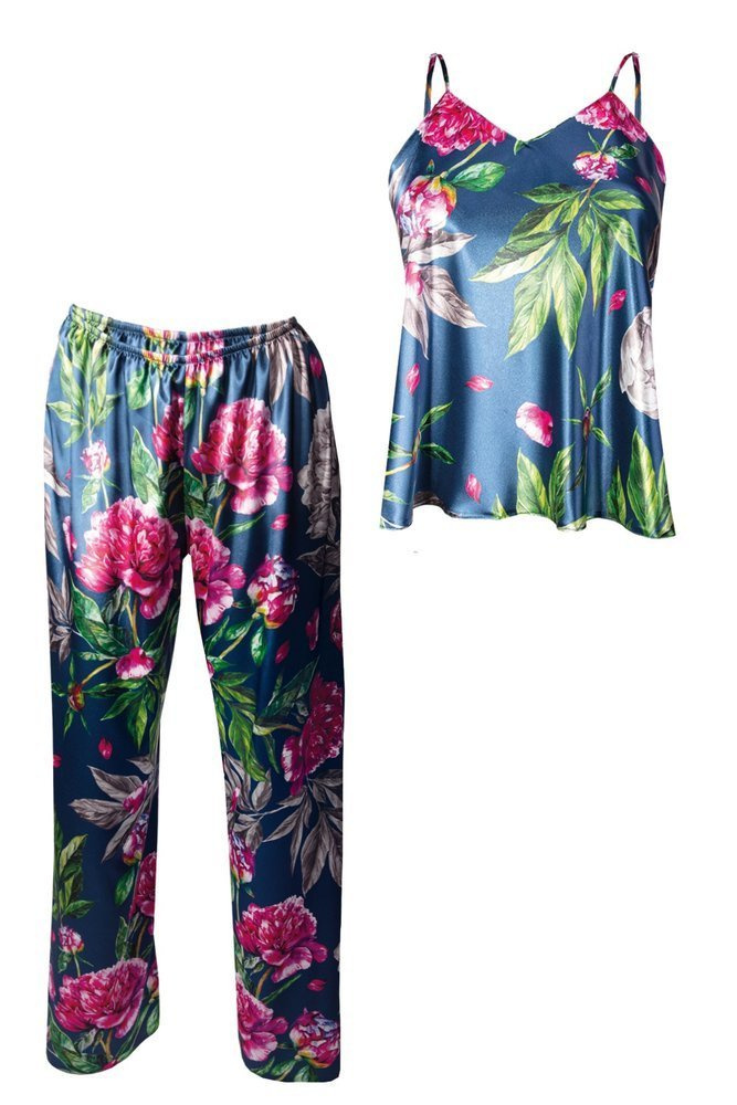 Prosty, zmysłowy dwuczęściowy komplet składający się z koszulki oraz długich spodni. Odważny dekolt w kształcie litery „V”, który jest niezwykle kuszący. Góra koszulki wykonana z drukowanej wzorzystej satyny. Wąskie ramiączka z regulacją zapewnią Tobie poczucie komfortu podczas snu. Spodnie proste, długie satynowe na cienkiej gumce dodające elegancji