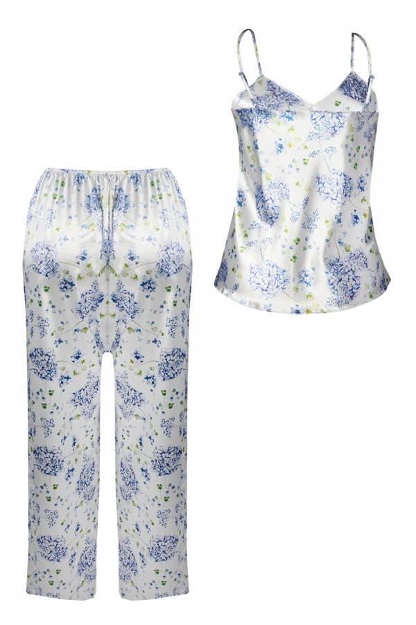 Prosty, zmysłowy dwuczęściowy komplet składający się z koszulki oraz długich spodni. Odważny dekolt w kształcie litery „V”, który jest niezwykle kuszący. Góra koszulki wykonana z drukowanej wzorzystej satyny. Wąskie ramiączka z regulacją zapewnią Tobie poczucie komfortu podczas snu. Spodnie proste, długie satynowe na cienkiej gumce dodające elegancji