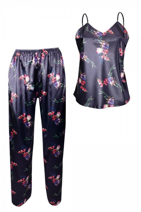 Prosty, zmysłowy dwuczęściowy komplet składający się z koszulki oraz długich spodni. Odważny dekolt w kształcie litery „V”, który jest niezwykle kuszący. Góra koszulki wykonana z drukowanej wzorzystej satyny. Wąskie ramiączka z regulacją zapewnią Tobie poczucie komfortu podczas snu. Spodnie proste, długie satynowe na cienkiej gumce dodające elegancji