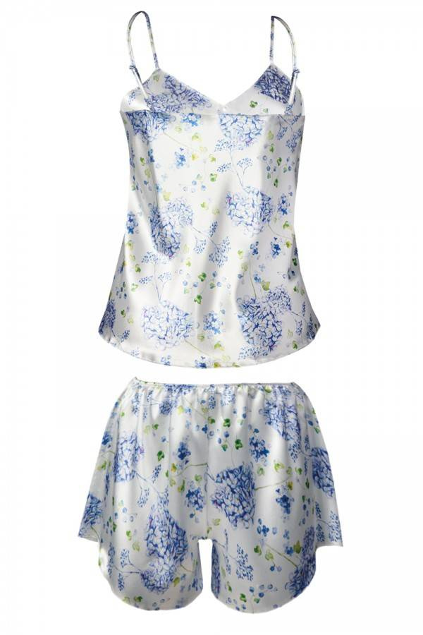Efektowna piżama damska wykonana z delikatnej, przyjemnej dla ciała satyny. Koszulka z głębokim dekoltem na wąskich regulowanych ramiączkach. Do kompletu krótkie spodenki, o luźnym kroju.